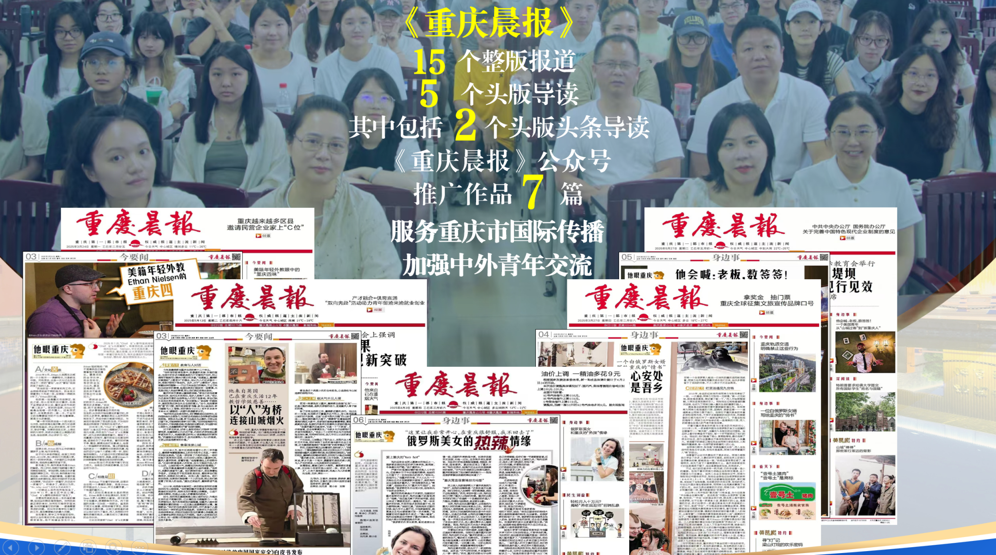 《他眼重庆》系列作品在《重庆晨报》整版刊发,并服务于重庆市国际传播。大二假期,17名同学主动奔赴重庆日报、重庆广电集团、上游新闻、凤凰网等专业媒体实习,在真实的新闻生产一线检验和提升专业能力。