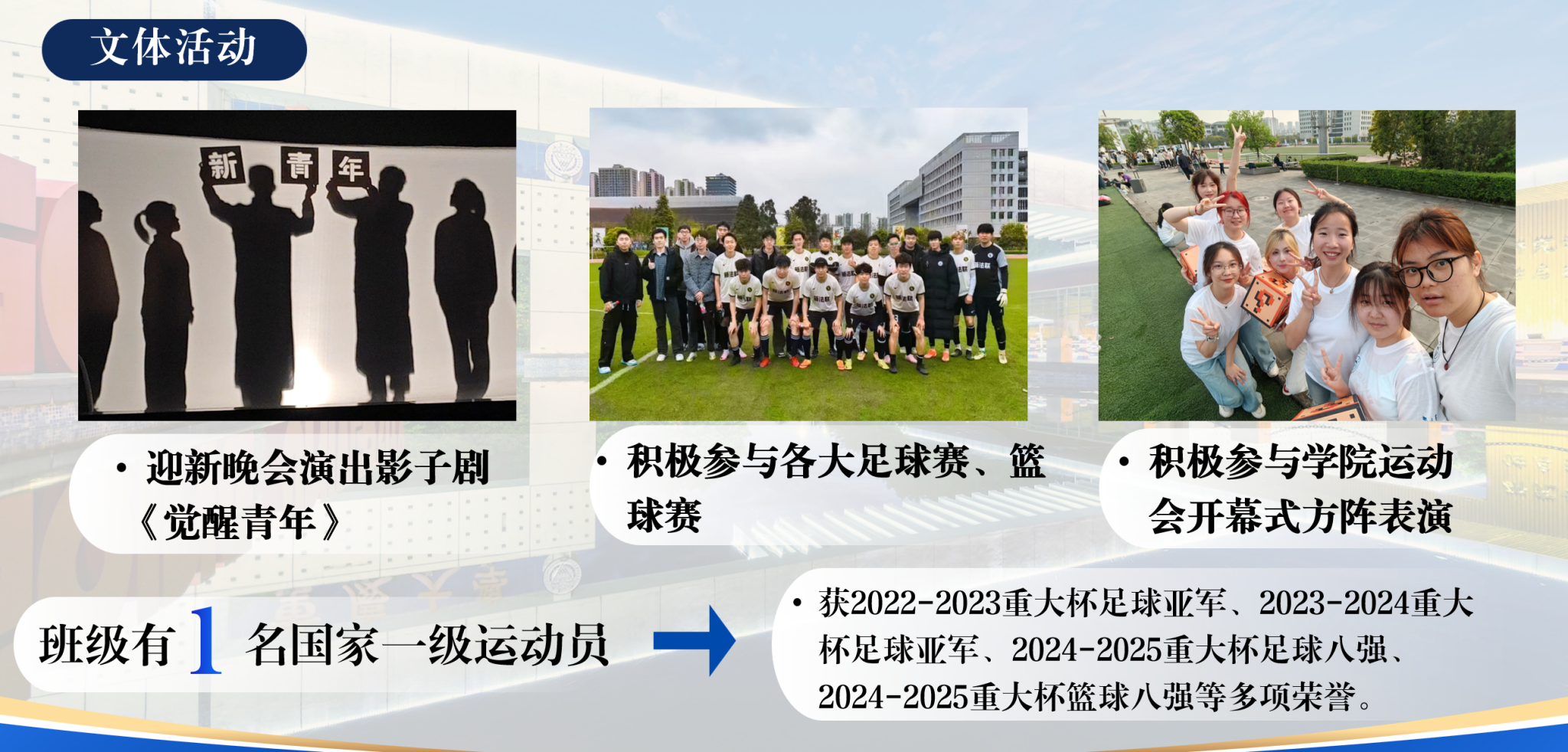 除了在专业和思想建设上追求卓越,2023级新闻学2班的同学们同样在文体领域绽放光彩。在迎新晚会上,他们的影子剧《觉醒青年》赢得满堂喝彩;在学院运动会上,他们展现出良好的精神风貌。班级中不乏多才多艺之士,有同学在书法比赛中获奖,有同学的诗歌作品发表于《北京文学》,更拥有一名国家一级运动员,与其他爱好体育的同学一起为班级和学院在“重大杯”足球、篮球等赛事中屡获佳绩。