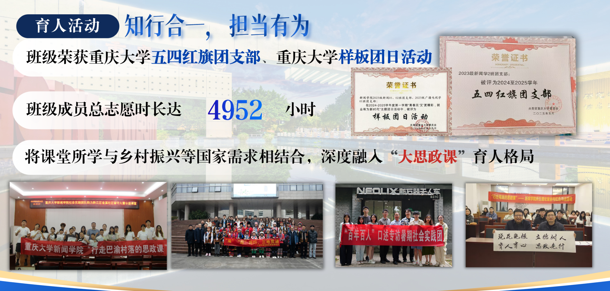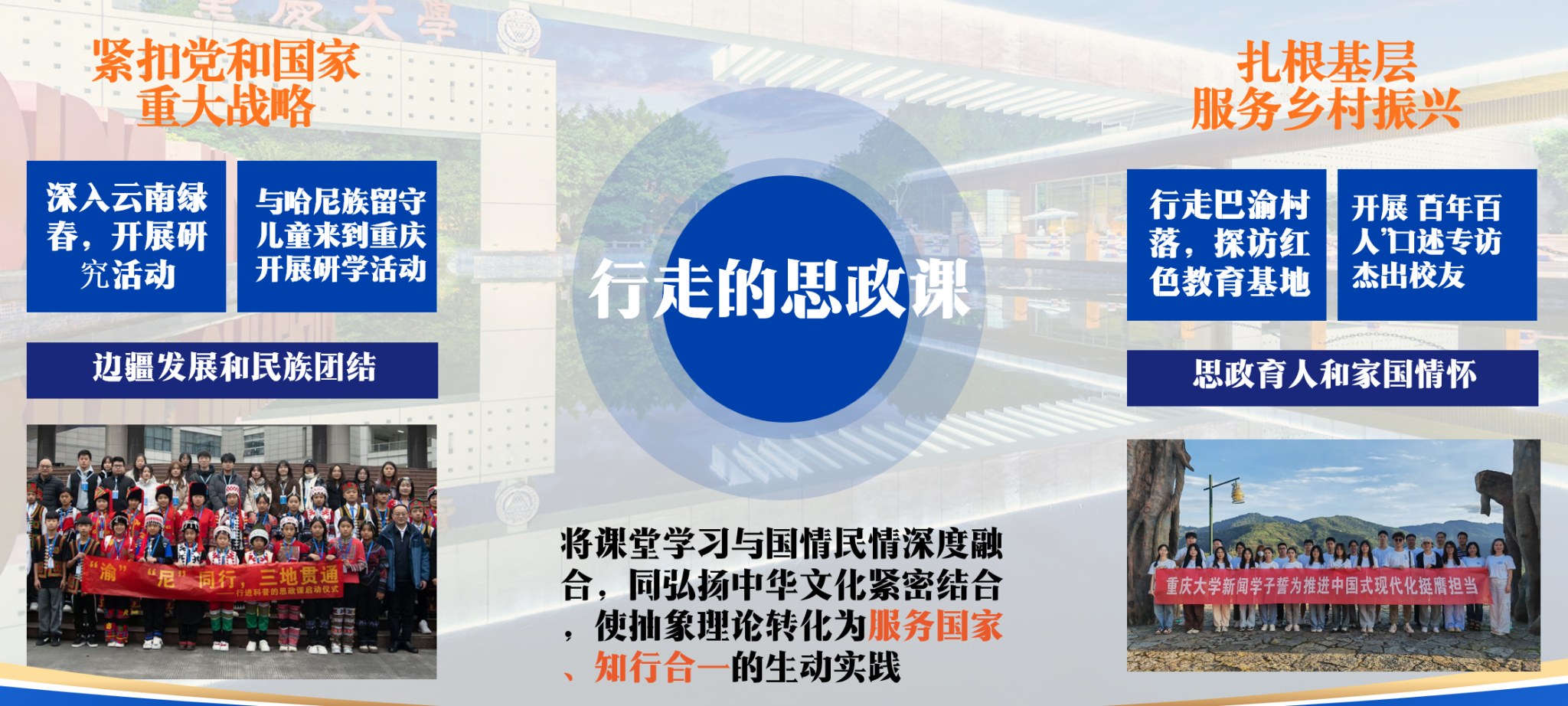 党委书记凌晓明的带领下,他们的“行走的思政课”走得深、走得实。班级同学深入云南绿春,开展实地调研,聚焦边疆发展;他们牵起哈尼族留守儿童的手,带他们来到重庆开展研学,用行动促进民族团结;他们行走于巴渝村落,扎根基层,感受并服务乡村振兴的脉搏;他们推进“百年百人”口述史计划,聆听杰出校友的奋斗故事,感悟深沉的家国情怀。