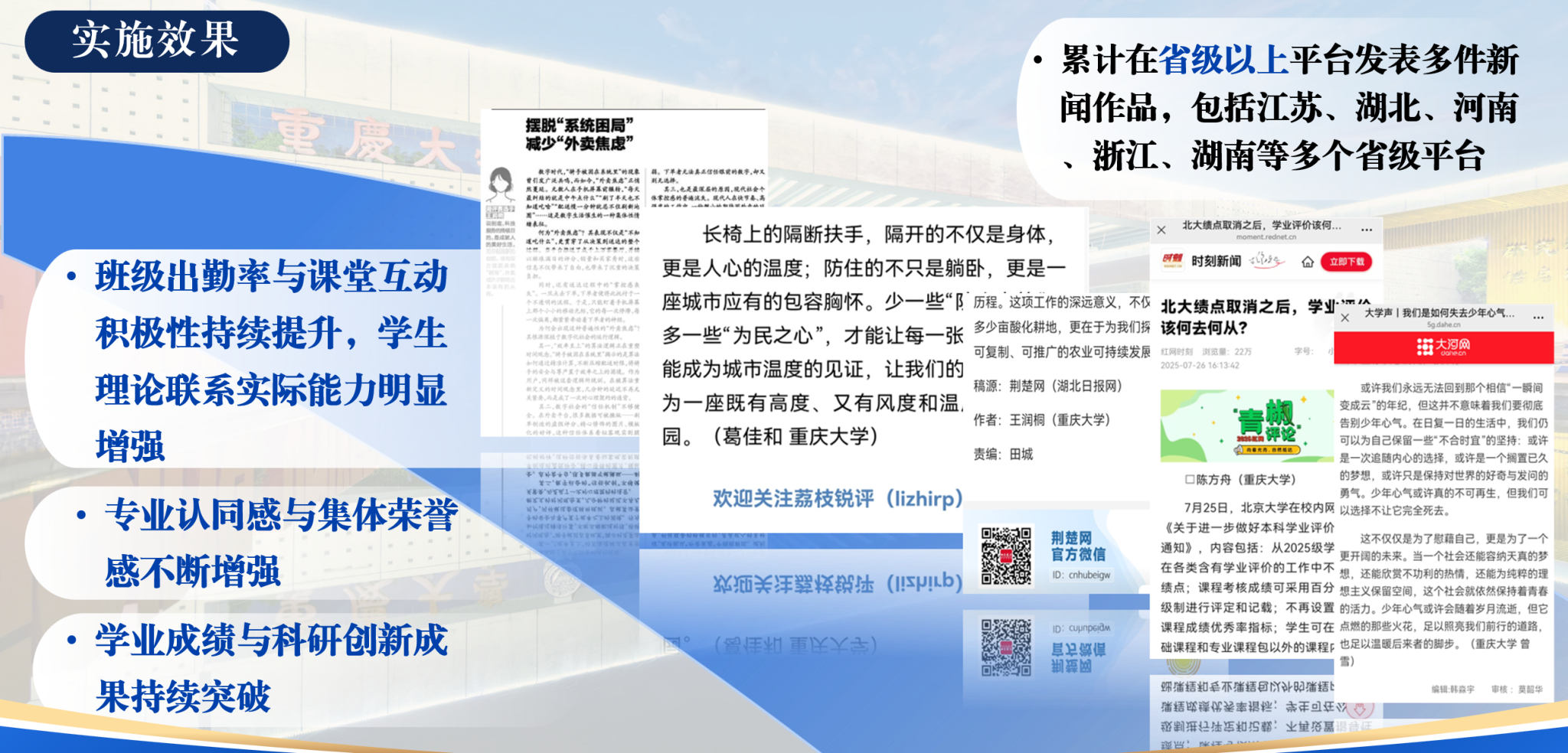 这些生动实践,不仅升华了同学们的思想认识,更转化为了高质量的新闻作品。班级同学累计在省级及以上平台发表新闻作品、评论逾百篇,在新华社、人民网、中国新闻网、学习强国、重庆华龙网等权威媒体平台发表报道47篇。