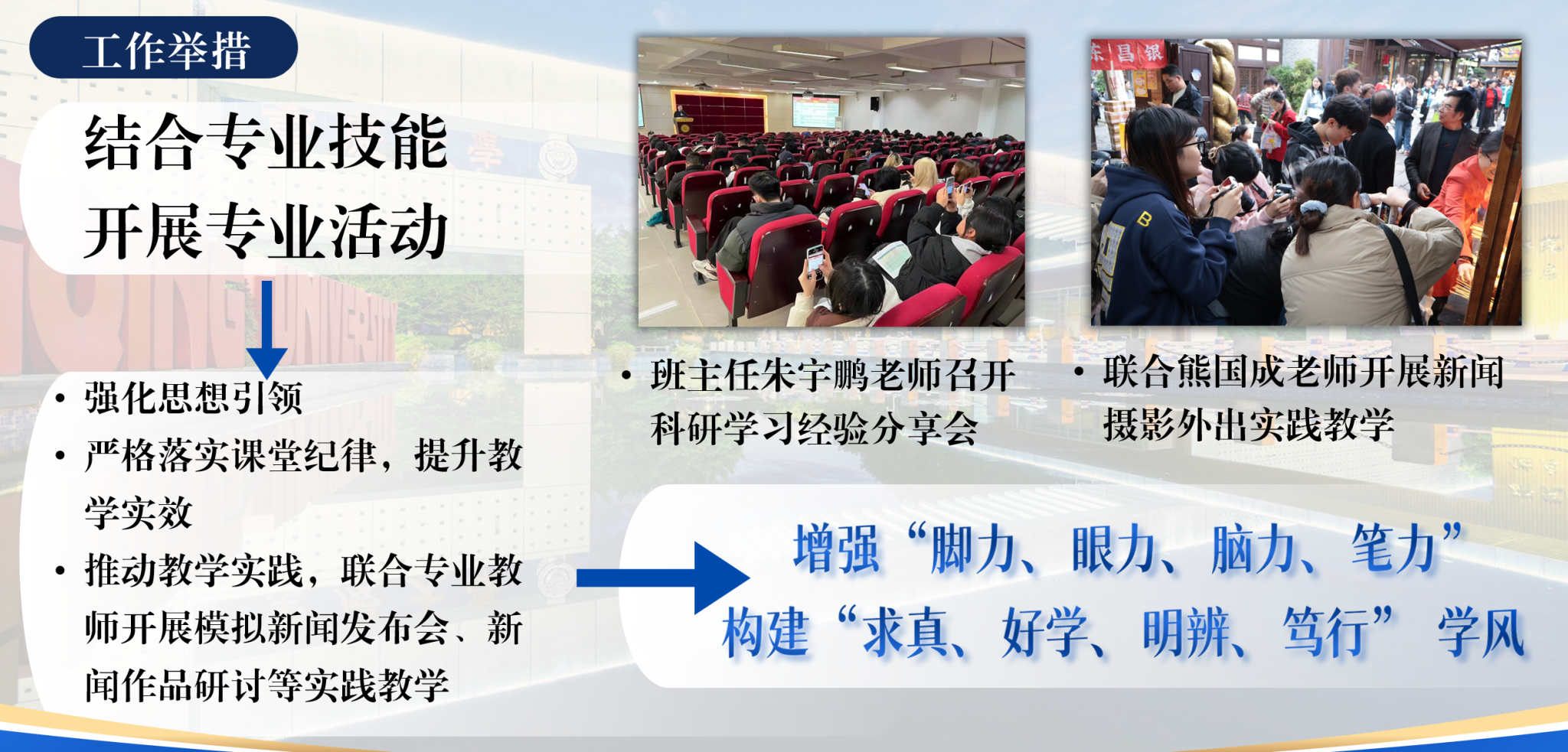 新闻是时代的日记,新闻人永远在路上。2023级新闻学2班深刻理解“知行合一”的内涵,将课堂延伸到社会广阔的天地中,在实践里淬炼新闻工作者的“脚力、眼力、脑力、笔力”。